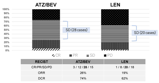 Two months after the initiation of systemic therapy (ATZ/BEV or LEN), the patients were evaluated by enhanced CT or MRI. Figure 1 shows the effectiveness of these chemotherapies, with DCRs of 74% and 62% and ORRs of 26% and 19% in the ATZ/BEV group and LEN group, respectively. Among these patients, 28 patients in the ATZ/BEV group and 20 patients in the LEN group had SD.