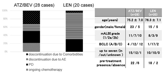 The final results of the initial systemic chemotherapy were investigated in the 28 SD patients in the ATZ/BEV group and the 20 SD patients in the LEN group. The clinical background is shown in the right panel of Figure 2. The rate of BCLC-C was significantly greater in the ATZ/BEV group than in the LEN group (43% vs. 10%, p = 0.0029), and there were no differences in the clinical background except for tumor burden, between these two groups. The first round of systemic chemotherapy was continued in six patients in the ATZ/BRV group and in no patients in the LEN group. ATZ/BEV therapy was discontinued in 22 patients, and LEN therapy was discontinued in all 20 patients. The main reasons for discontinuation of ATZ/BEV treatment were PD and worsening of comorbidities, whereas most discontinuations of LEN treatment were due to adverse events, such as appetite loss or general fatigue.