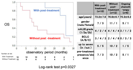 The OS rate was examined for 22 patients who discontinued ATZ/BEV with or without post-treatment. Those with post-treatment were treated with chemotherapy and/or locoregional therapy after 1st regimen of chemotherapy. As shown in the right panel of Figure 3, there were no differences in the clinical background or tumor burden between patients with and without post-treatment with ATZ/BEV. OS was significantly longer in the post-treatment group than in the nontreatment group (MST 25.2 months vs. 10.3 months, p = 0.0327).
