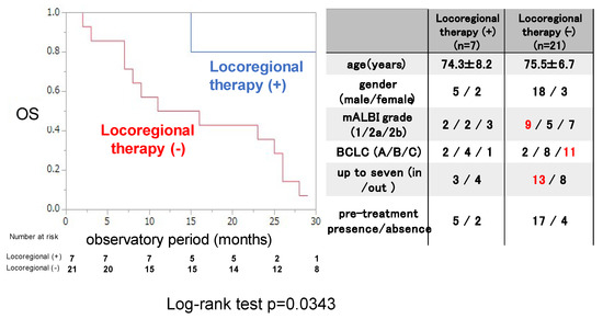 Next, the OS rate was examined for 7 patients who were treated with locoregional therapy during and after ATZ/BEV therapy and 21 patients who were not. The clinical background is shown in the right panel of Figure 4. The rate of BCLC-C was significantly lower with locoregional therapy than without it, and there were no differences in clinical background, except for the tumor burden, between these two groups (those without locoregional therapy had a higher proportion of within up-to-7 criteria). The OS rate was significantly greater in patients who received locoregional therapy than in those who did not (MST not reached vs. 15.1 months, p = 0.0343).