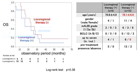 The OS rate was examined for 5 patients who were treated with locoregional therapy during and after LEN therapy and 15 patients who were not. The clinical background is shown in the right panel of Figure 5. The mean age was significantly younger in patients who received locoregional therapy than in those who did not receive locoregional therapy, and there were no differences in clinical background except for the mean age between these two groups. The OS rate did not significantly differ between patients who received locoregional therapy and those who did not, not like the ATZ/BEV case.