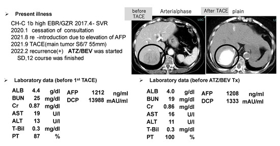 One of the SD patients who received ATZ/BEV therapy and ultimately achieved CR after receiving locoregional therapy. Upper left panel: history of the present illness and HCC therapy. Upper right panel: CT image (left: arterial phase, right plain) before and after TACE (the tumor is marked by a bold circle). Lower panel: laboratory data before TACE (left) and before ATZ/BEV therapy (right).