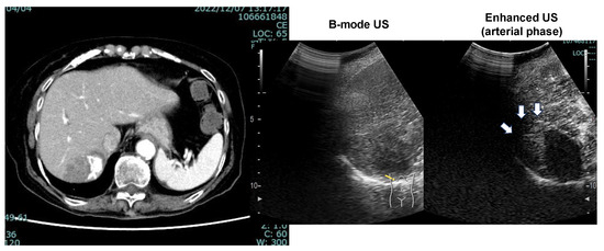 CT image (arterial phase) and enhanced US after 12 courses of ATZ/BEV therapy. Left panel: CT image showing the disappearance of lipiodol and the appearance of arterial flow on the right side of the HCC. Right panel: Contrast-enhanced ultrasound revealing arterial flow in the arterial phase and a defect in the Kupffer phase.