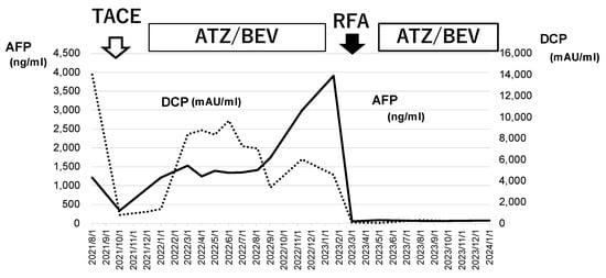 Changes in tumor marker levels during ATZ/BEV chemotherapy and RFA. The values of AFP and DCP before TACE and at the end of ATZ/BEV therapy via the RFA procedure are shown. These tumor markers decreased to normal levels after RFA and remained normal during ATZ/BEV chemotherapy. AFP: alpha-fetoprotein, DCP: Des-γ-carboxy prothrombin, TACE: transcatheter arterial chemoembolization, RFA: radiofrequency ablation.