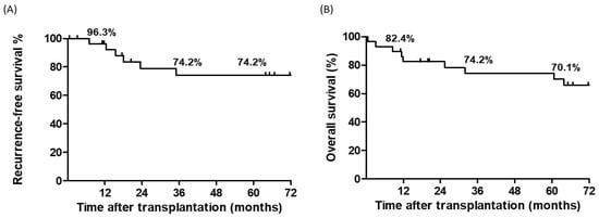 The primary outcomes were HCC recurrence-free survival (RFS) and overall survival (OS). RFS was calculated from the date of LT to HCC recurrence, and OS was calculated from the date of LT to death or the end of the study period. Survival curves were constructed using the Kaplan–Meier method and compared using the log-rank test. Categorical variables were compared using χ2 or Fisher’s exact test, as appropriate, while continuous variables were compared using Student’s t-test. Multivariate analysis was not performed because of the small sample size. Statistical analyses were performed using the SPSS software package (version 25.0; SPSS, Inc., Chicago, IL, USA) for Windows, and p < 0.05 was considered statistically significant.