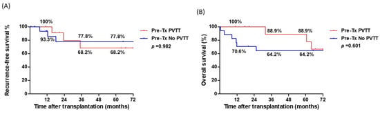 Among the 29 patients with HCC and PVT, the 1-, 3-, and 5-year RFS rates after LT were 96.3%, 74.2%, and 74.2%, respectively, whereas the 1-, 3-, and 5-year OS rates were 82.4%, 74.2%, and 70.1%, respectively (Figure 2). Patients with pre-transplant PVTT who underwent downstaging therapy were further compared with those who were PVTT-free pre-transplant. RFS and OS rates were not significantly different between the two groups (Figure 3). The 5-year RFS and OS rates were 68.2% and 77.8%, and 88.9% and 64.2%, respectively.