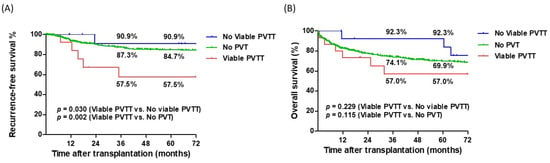 Patients with macrovascular invasion, indicated by viable HCC in the portal vein, showed a significantly lower RFS than those without viable PVTT (p = 0.030) and other HCC patients (n = 472) without PVT (p = 0.002) (Figure 4A, p = 0.006). However, the comparison of OS was a not significant difference (Figure 4B, p = 0.251). Among patients without viable PVTT, the 1-, 3-, and 5-year RFS rates post-LT were 100%, 90.9%, and 90.9%, respectively, whereas the OS rates were 92.3%, 92.3%, and 92.3%, respectively. In contrast, for patients with viable PVTT, the 1-, 3-, and 5-year RFS rates after LT were 92.3%, 57.5%, and 57.5%, respectively, whereas the OS rates were 73.3%, 57.0%, and 57.0%, respectively. Among other HCC patients without PVT, the 1-, 3-, and 5-year RFS rates and OS rates after LT were 93.8%, 87.3%, and 84.7% and 83.0%, 74.1%, and 69.9%, respectively.