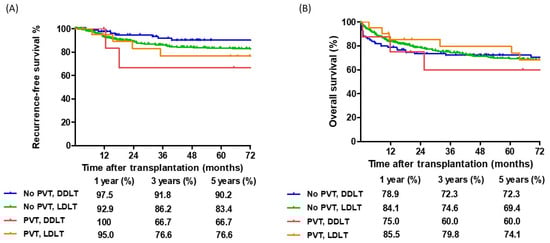 However, thrombosis within the portal venous system may also occur because of underlying cirrhosis, complicating the decision-making process for LT in patients with HCC and thrombosis within the portal vein. Specifically, it may be challenging to differentiate between benign thrombosis and tumor thrombus when thrombosis develops in the portal vein of patients with HCC. Consequently, PVTT is often only incidentally discovered in explanted livers on histological examination, following strict transplantation criteria. Additionally, patients with advanced HCC comorbid with PVTT may be eligible for transplantation following successful downstaging to meet LT criteria [8,9,10,11]. Therefore, this study aimed to analyze the outcomes of LT in patients with HCC and portal vein thrombosis (PVT) and specifically evaluate the impact of PVTT on long-term survival.
