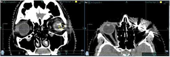 T1-weighted MRI sequences prior to the radiotherapy revealed hypodense areas at the position of the SFM. They were less visible than in the CT scan. In CT, the SFM showed a clear hyperdense signal without any scattering artifacts, which allowed the precise labeling of the target tumor volume (Figure 3). The maximum Hounsfield unit (HU) of the markers ranged from 120 to 140 HU as compared to the corpus vitreum (−10 to +10 HU) and the choroidea (40 to 60 HU) in the CT.