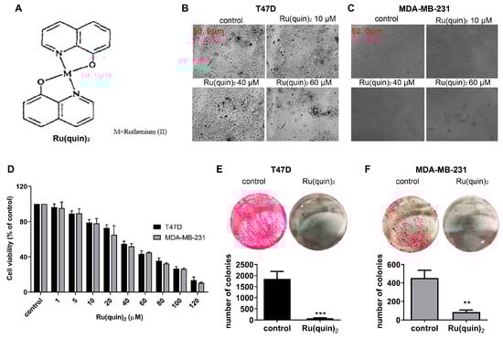 One thousand T47D and MDA-MB-231 cells were seeded in 6-well plates and cultured in their respective growth media. After 24 h, the media were removed, and the cells were washed twice with PBS. Subsequently, the cells were treated with 60 µM Ru(quin)2 for 72 h. Following treatment, the drug-containing media were removed, and the cells were cultured in fresh media for an additional two weeks to allow colony formation. Finally, the resulting cell colonies were counted [41].