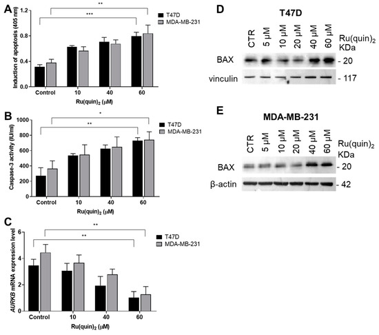 To determine whether Ru(quin)2-induced apoptosis in T47D and MDA-MB-231 cells involved caspase-3 activation, caspase-3 activity was measured according to the manufacturer’s instructions. Our data reveal that Ru(quin)2 treatment significantly increased caspase-3 activity in both T47D and MDA-MB-231 cells compared to untreated controls after 24 h (Figure 2B). Additionally, we explored the role of Aurora B kinase (AURKB), a key regulator of mitosis and apoptosis in cancer cells [42]. In our study, mRNA expression of AURKB was downregulated in both T47D and MDA-MB-231 cells following 24 h treatment with Ru(quin)2 (Figure 2C). A central regulator of apoptosis is BAX, a pro-apoptotic member of the Bcl-2 family that promotes mitochondrial outer membrane permeabilization, leading to cytochrome c release and subsequent caspase activation [44]. Upregulation of BAX is crucial for the initiation of apoptosis in cancer cells [45]. Our results show that Ru(quin)2 treatment significantly increased BAX protein levels in both T47D (Figure 2D) and MDA-MB-231 cells (Figure 2E).