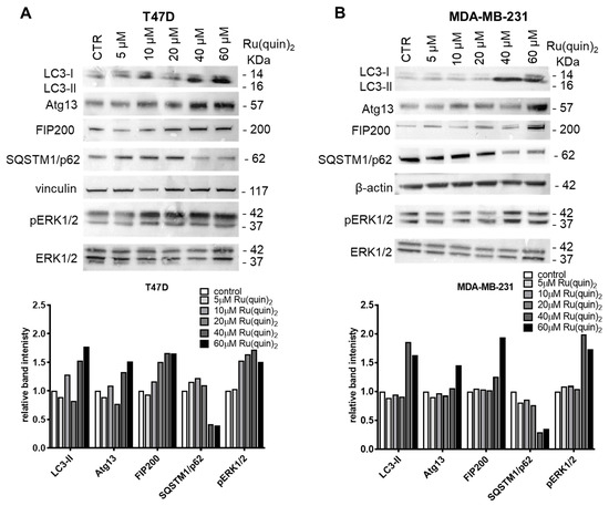 Ru(quin)2 promotes autophagy in ER+ and TNBC breast cancer cells. (A) Immunoblot analysis of autophagy-related markers LC3, Atg13, FIP200, SQSTM1/p62, vinculin, phosphorylated ERK1/2 (Thr 202 and Tyr 204), and ERK1/2 in T47D cells treated with Ru(quin)2. The intensity of the LC3-II, Atg13, FIP200, and SQSTM1/p62 bands was quantified and normalized to that of vinculin bands, whereas the phosphorylated ERK1/2 bands were quantified and normalized to the respective total ERK1/2 bands. (B) Immunoblot analysis of autophagy-related markers LC3, Atg13, FIP200, SQSTM1/p62, β-actin, phosphorylated ERK1/2 (Thr 202 and Tyr 204), and ERK1/2 in MDA-MB-231 cells treated with Ru(quin)2. The intensity of the LC3-II, Atg13, FIP200, and SQSTM1/p62 bands was quantified and normalized to that of β-actin bands, whereas the phosphorylated ERK1/2 bands were quantified and normalized to the respective total ERK1/2 bands. Representative blot from three independent experiments is shown. Abbreviations: ER+—estrogen receptor-positive, TNBC—triple-negative breast cancer, LC3—microtubule-associated proteins 1A/1B light chain 3, Atg13—autophagy-related protein 13, FIP200—focal adhesion kinase family interacting protein of 200 kDa, SQSTM1/p62—sequestosome 1. The original Western blot figures can be found in Supplementary File S1.