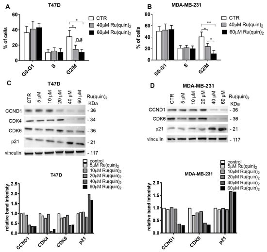 Ru(quin)2 induces G0/G1 phase cell cycle arrest in ER+ and TNBC breast cancer cells. (A) Flow cytometry analysis of the percentage of cells in each cell cycle phase (G1, S, and G2/M) in T47D cells treated with Ru(quin)2. (B) Flow cytometry analysis of cell cycle phases in MDA-MB-231 cells treated with Ru(quin)2. (C) Immunoblot analysis of CCND1, CDK4, CDK6, p21, and vinculin in T47D cells following Ru(quin)2 treatment. The intensity of the CCND1, CDK4, CDK6, and p21 bands was quantified and normalized to that of vinculin bands. (D) Immunoblot analysis of the same markers in MDA-MB-231 cells. The intensity of the CCND1, CDK6, and p21 bands was quantified and normalized to that of vinculin bands. Data represent the mean ± SD of three independent experiments performed in triplicate. Representative blot from three independent experiments is shown. Statistical significance: * p < 0.05; **: p < 0.01; n.s: non-significant. Abbreviations: ER+—estrogen receptor-positive, TNBC—triple-negative breast cancer, CDK—cyclin-dependent kinase, CCND1—cyclin D1. The original Western blot figures can be found in Supplementary File S1.