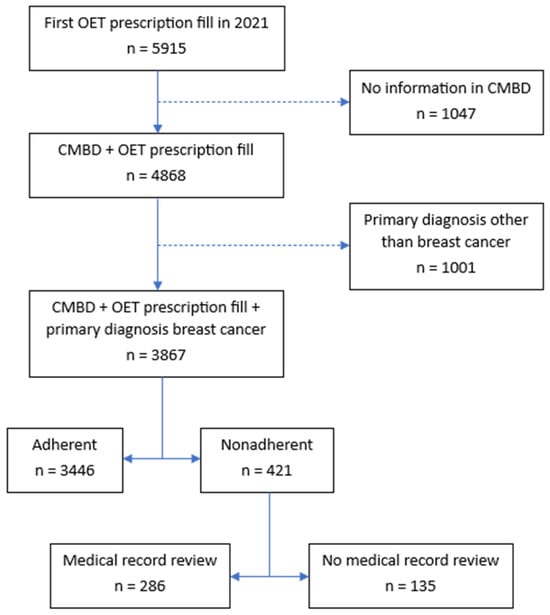 Flow diagram of all patients diagnosed with breast cancer through the public health system of Catalonia (Spain) who first filled a prescription for oral endocrine therapy in a community pharmacy in 2021. Abbreviations: CMBD, hospital discharge records in the national health system (Conjunto Mínimo Básico de Datos); n, number of patients; OET, oral endocrine therapy.