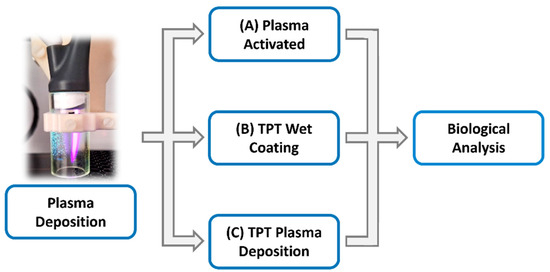 Schematic of the plasma deposition protocol whereby the plates were treated with different approaches. (A) Plasma-activated protocol, where the plate was treated only with plasma discharge; (B) TPT wet-coating protocol, where the plate was treated using only a constant flow of nebulized TPT; (C) TPT plasma deposition protocol, where the plasma discharge was combined with the nebulized TPT. Plates without any deposition treatment were used as control for all the biological experiments.
