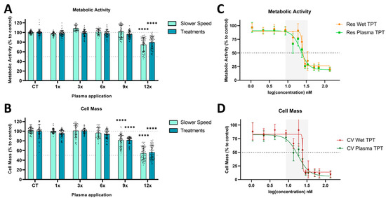Cells were treated with either direct plasma, wet TPT (wet-deposited TPT using nebulizer), or plasma TPT (plasma-deposited TPT). Subsequently, the metabolic activity (resazurin) and cell mass (crystal violet) were evaluated (Figure 3). The results demonstrated that direct plasma treatment produced comparable cytotoxic effects when considering multiple treatments or slower speed (Figure 3A,B). However, even after 12 treatment cycles/12× slower speed, the plasma treatment was only able to reduce the cell viability to around 50% (preventing the proper calculation of the true IC50 value). A comparison between the effects of wet TPT and plasma TPT highlighted a potential area of interest for deposition application (Figure 3C,D—grey area). Additionally, the calculated IC50 values revealed that wet TPT requires approximately 25% higher concentration of TPT deposited to achieve a similar effect to that of plasma TPT (Table 1).
