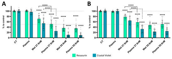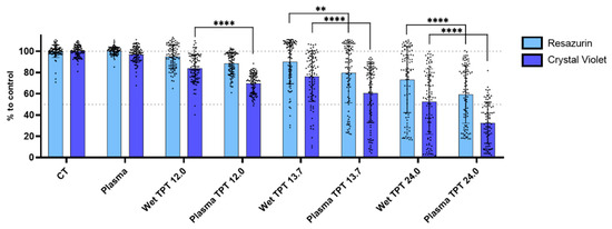 For the A375 cell line both metabolic activity and cell mass decreased with wet TPT 27.9 (71.05 ± 12.59% and 59.78 ± 18.38%) and wet TPT 55.9 (36.41 ± 12.70% and 12.03 ± 11.53%). The plasma deposition treatment promoted a significantly enhanced effect (p < 0.0001) when compared to the wet deposition with TPT 27.9, reducing both metabolic activity (51.23 ± 15.68%) and cell mass (28.19 ± 20.67%) (Figure 6A). For higher concentrations of TPT, no statistical significance was observed between the two treatments with TPT 55.9.