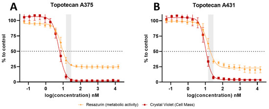 Dose–response effect of TPT individual treatment in melanoma and squamous carcinoma cell lines. Dose–response curves for metabolic activity and cell mass were obtained by resazurin and crystal violet assays. IC50 curves of TPT treatment alone (A) in the A375 melanoma cell line and (B) in the A431 squamous carcinoma cell line. Results are presented as mean ± SD and as comparison to control.