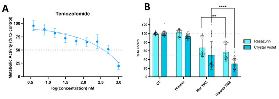 TMZ plasma deposition presented a more consistent cytotoxic effect in the U-251mg cell line than the wet coating. These results were obtained 72 h after treatment with TMZ, direct plasma, wet-, or plasma-deposited TMZ, via resazurin and crystal violet assays. (A) Dose–response curve for TMZ treatment alone and (B) quantification of the combinatorial effect in glioblastoma cells using resazurin and crystal violet assays 72 h after treatment with plasma (3× slower speed), wet-, or plasma-deposited TMZ (30 µM). Results are presented as mean ± SD and as comparison to control. Statistical significance is represented as ** p < 0.01; **** p < 0.0001.