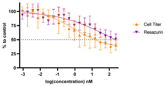 Metabolic activity dose–response effect of TPT treatment alone in the U-251mg glioblastoma cell line spheroids. Dose–response curves were obtained via resazurin and CellTiter-Glo® 3D assays 72 h post-treatment. Results are presented as mean ± SD and as comparisons to control.