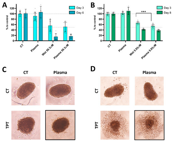 The treatments with 59.3 μM of TPT resulted in a decrease in metabolic activity at day 3, with wet TPT 59.3 showing a reduction to 56.57% ± 21.93 and plasma TPT 59.3 to 51.80% ± 18.56. By day 6, the metabolic activity further decreased to 15.39% ± 10.18 with wet TPT 59.3 and to 16.78% ± 6.51 with plasma TPT 59.3 (Figure 9A), with no significant statistical difference between the two treatments. The images of spheroids treated with wet or plasma TPT 59.3 did not show any noticeable distinction between wet and plasma deposition, after 3 or 6 days, respectively (Figure 9C,D). When the TPT concentration was reduced 10-fold, the metabolic activity exhibited a decrease 3 days after treatment with wet and plasma TPT 5.93 at 66.53% ± 4.45 and 54.68% ± 7.83, respectively, showing a significantly stronger reduction in plasma TPT treated samples. By day 8, the metabolic activity remained around 42.19% ± 3.52 and 37.97% ± 4.11 (Figure 9B).