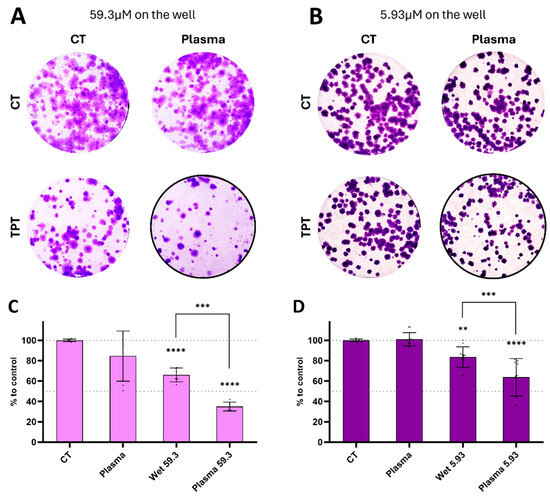 The clonogenic assay results indicated a reduction in both colony formation and colony size, particularly evident with the combination treatment, even at lower concentrations of TPT (Figure 10A,B). The total cell mass showed a decrease following treatment with wet TPT 59.3 (66.03% ± 6.74), plasma TPT 59.3 (35.01% ± 4.37), wet TPT 5.93 (83.66% ± 10.03), and plasma TPT 5.93 (63.75% ± 18.34), as compared to the controls (Figure 10C,D).