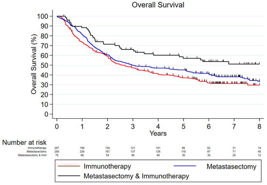 In terms of treatment, surgery at the primary site was performed in 23.6% of the patients in the metastasectomy cohort, 41.2% of the patients in the immunotherapy cohort, and 33.3% in the metastasectomy plus immunotherapy cohort, respectively (Table 2). Moreover, only 4.6%, 12.0%, and 9.0% of the patients in the metastasectomy, immunotherapy, and metastasectomy plus immunotherapy cohorts, respectively, received radiation therapy. Finally, the majority of patients were treated in academic hospitals (49.0%) and in metropolitan areas (79.4%).