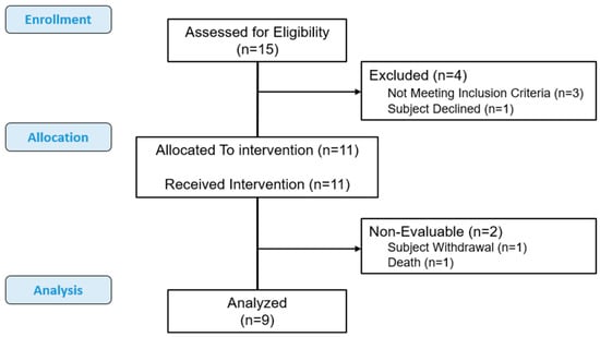Sample size calculation: The study had Simon’s minimax design, with a plan to enroll 18 patients in stage 1. In stage 1, n1 = 18 was to be enrolled, and the response was evaluated. If T1 = 3 or fewer responses were observed, the study would terminate, and the treatment would not be considered promising; otherwise, an additional n2 = 19 patients would be enrolled in stage 2. If T = 8 or fewer of the total n = n1 + n2 = 37 patients had a response, the treatment would not be considered promising; otherwise, the treatment would be considered promising for further study. Unfortunately, due to a lack of funding, the study was closed to accrual after enrolling 11 patients.