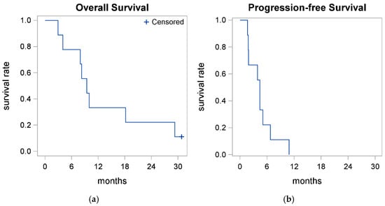We evaluated the overall (OS) and progression-free survival (PFS) of all evaluable patients on nal-IRI and 5-FU. The median OS was 9.4 months (95% CI 2.9–29.3 mo) after a median follow-up of 30.8 months, and the median PFS was 4.4 months (95% CI 1.7–6.7 mo). The 1-year OS rate was 0.33 (95% CI 0.08–0.62). There were a total of 10 deaths during the study period. The one patient still alive has been on follow-up for 30.8 months at the time of the data cutoff (Table 3 and Figure 3).