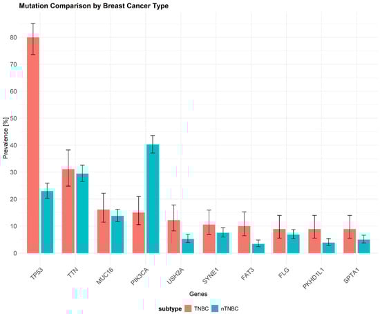 The frequency of somatic mutations in triple-negative breast cancer (TNBC; red) versus other breast cancer subtypes (nTNBC; teal) based on data from The Cancer Genome Atlas (TCGA) database (URL: https://www.cancer.gov/ccg/research/genome-sequencing/tcga (accessed on 16 November 2024)) using TCGAbiolinks package. Mutation data for breast cancer subtypes were processed with the maftools package, and the mutation dataset originates from the study [40] (URL: https://doi.org/10.1016/j.cels.2018.03.002 (accessed on 16 November 2024)). The most frequently mutated genes are shown along with their mutation rates in TNBC samples. The x-axis represents the different mutated genes, while the y-axis indicates the percentage of samples exhibiting mutations in each gene. TP53 exhibits the highest mutation frequency (80%) in TNBC, whereas PIK3CA shows a notably lower mutation rate compared to other breast cancer subtypes (15%). Data represent ten selected genes with the highest mutation frequency. TP53—Tumor Protein P53, TTN—Titin, MUC16—Mucin 16, PIK3CA—Phosphatidylinositol-4,5-Bisphosphate 3-Kinase Catalytic Subunit Alpha, USH2A—Usher Syndrome Type 2A, SYNE1—Spectrin Repeat Containing Nuclear Envelope Protein 1, FAT3—FAT Atypical Cadherin 3, FLG—Filaggrin, PKHD1L1—Polycystic Kidney and Hepatic disease 1 like 1, SPTA1—Spectrin Alpha Chain, Erythrocytic 1.
