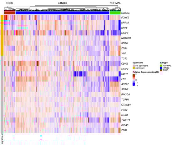 A heatmap representing the gene expression profiles of EMT-related genes across TNBC, other breast cancer subtypes (nTNBC), and normal tissues. The data were derived from the TCGA database, with expression levels normalized, log-transformed, and standardized for comparability. The analysis incorporates mutation data from the Broad Institute TCGA Genome Data Analysis Center (2016), generated using MutSig 2CV v3.1 [82]. Genes with an expression threshold of |log2(expression)| ≥ log2(1.5) and statistical significance adjusted p-value < 0.05 were included (significant—orange and not significant—gray). Hierarchical clustering was performed for samples, revealing distinct expression patterns that differentiate TNBC from nTNBC. Expression levels above the median are shown in red (upregulated), those below the median in blue (downregulated), and values close to the median in white. Color intensity reflects the magnitude of deviation from the median. FOXC2—Forkhead Box C2, KRT18—Keratin 18, KRT8—Keratin 8, MMP9—Matrix Metallopeptidase 9, NOTCH1—Notch Receptor 1, SNAI1—Snail Family Transcriptional Repressor 1, ZEB1—Zinc Finger E-box Binding Homeobox 1, VIM—Vimentin, TCF3—Transcription Factor 3, CDH2—Cadherin 2, MMP2—Matrix Metallopeptidase 2, CDH1—Cadherin 1, FN1—Fibronectin 1, ACTA2—Actin Alpha Cardiac Muscle 2, SNAI2—Snail Family Transcriptional Repressor 2, PIK3CA—Phosphatidylinositol 4,5-bisphosphate 3-kinase Catalytic Subunit Alpha, TGFB1—Transforming Growth Factor Beta 1, CTNNB1—Catenin Beta 1, PTK2—Protein Tyrosine Kinase 2, ITGB1—Integrin Subunit Beta 1, TWIST1—Twist Family BHLH Transcription Factor 1, ITGA5—Integrin Subunit Alpha 5, ZEB2—Zinc Finger E-box Binding Homeobox 2.