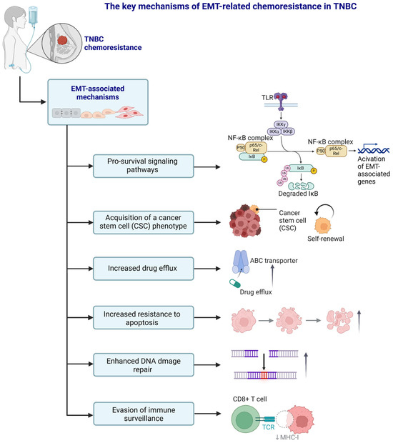 A schematic representation of the selected, key EMT-related chemoresistance mechanisms in TNBC. Created in https://BioRender.com. The upper NF-κB part modified from the BioRender template after Ruslan Medzhitov et al. (Janeway’s Immunobiology, 8th Edition; Garland Science, New York, 2012).