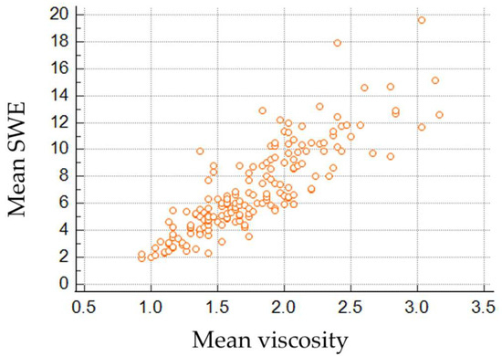 A total of 245 patients were included in the study, of whom 179 patients underwent both mammography and ultrasound examinations, while 66 patients underwent only ultrasound examination. The mean age was 48 years. The SWE and viscosity values of normal breast parenchyma had a non-normal distribution. The overall median and 25–75% percentiles for elasticity were 6.03 (4.65, 9.02) kPa, and for viscosity were 1.7 (1.43, 2.03) Pa.s. A strong and direct proportional correlation between SWE and viscosity values was recorded (rho of 0.866, p < 0.001) (Figure 2).