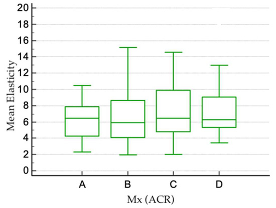For the 179 patients who underwent both mammographic and ultrasound examinations, a possible correlation between mammographic American College of Radiology (ACR) breast density categories and the values of SWE and viscosity was analyzed. Measurements obtained for each type of breast density are shown in Table 1, Figure 3 and Figure 4. No statistically significant difference was found between SWE or viscosity values in different ACR types of breasts (Kruskal–Wallis test for SWE p = 0.305 and viscosity p = 0.099).