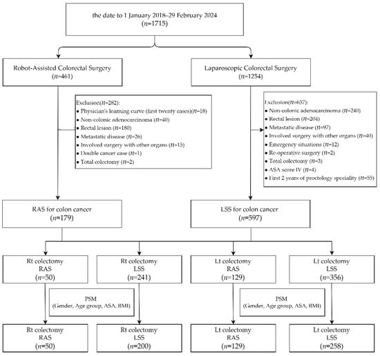 From 1 January 2018 to 29 February 2024, a total of 1715 minimally invasive colorectal surgery patients were enrolled, with 461 of the surgeries having used robotic assistance and 1254 having been laparoscopic. Amongst the 461 robotic cases, the following were excluded: 180 cases that had a lesion located in the rectal segment, 40 that were diagnosed as non-colonic adenocarcinoma, 26 that were diagnosed as metastatic disease, 18 that were within the robotic system learning curve (the first 20 cases) of each surgeon, 15 that had undergone surgery involving other organs, 2 total colectomy cases, and 1 double cancer case. Amongst the 1254 cases that underwent laparoscopic surgery, the following were excluded: 240 cases involving non-colonic adenocarcinoma, 204 that were a lesion located in the rectal segment, 97 that were diagnosed as metastatic disease, 40 that involved surgery with other organs, 12 that were emergency situations, 4 that were classified as ASA score IV, 3 that were undergoing total colectomy, 2 that involved re-operative surgery, and 55 cases performed within the first two years of each proctologist’s career (the first 60 cases for each surgeon). A total of 179 cases of robotic-assisted surgery performed by two surgeons and 597 cases of laparoscopic surgery performed by fourteen surgeons for colon cancer were included. We divided the patients into two groups based on the type of surgery: right colectomy (RC) and left colectomy (LC). The RC group included 50 patients who underwent robotic-assisted surgery (RAS) and 241 patients who underwent laparoscopic surgery (LSS), while the LC group included 129 RAS patients and 356 LSS patients. After propensity score matching for gender, age group, ASA score, and BMI, the RC group consisted of 50 RAS patients and 200 LSS patients, and the LC group consisted of 129 RAS patients and 258 LSS patients (Figure 1).