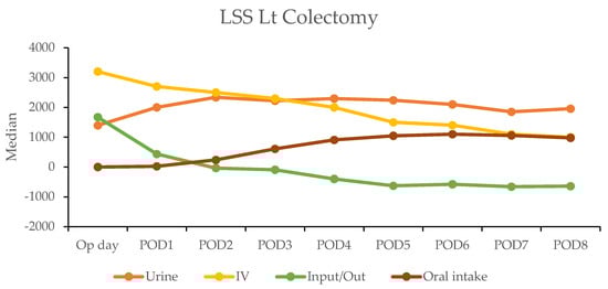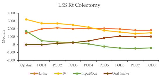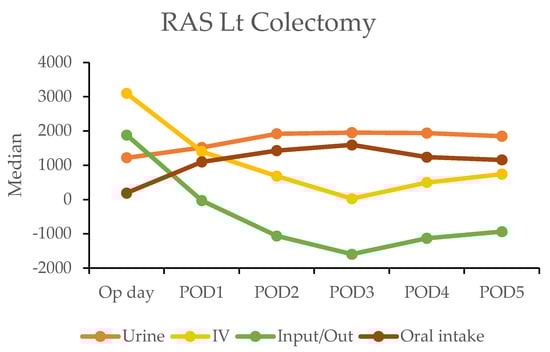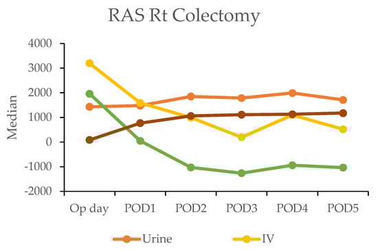 In the robotic-assisted surgery (RAS) group, the urine output remained stable over the subsequent days. The IV fluid amount was higher on the operation day due to the fluid given during the operation (Table 4). A notable negative fluid balance (IV fluid minus urine output (input/output)) was observed on postoperative day two for RC (−1025 mL) and day one for LC (−30 mL). This indicated the transition from the inflammatory to diuretic phases (Figure 2).