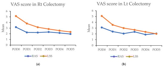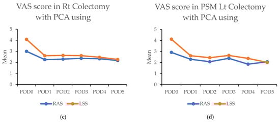 (a,b) Figures showing highest visual analog scale (VAS) pain scores by postoperative day (POD) in robotic-assisted surgery (RAS) and laparoscopic surgery (LSS). Patients underwent right colectomy and left colectomy. (c,d) Figures showing highest visual analog scale (VAS) pain scores by postoperative day (POD) in robotic-assisted surgery (RAS) and laparoscopic surgery (LSS) patients using patient-controlled analgesia (PCA).