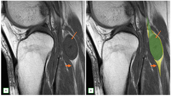 Benign nerve sheath tumor (schwannoma) in a 48-year-old man with a popliteal fossa lump. Sagittal T1 (A) and Sagittal T2 overlay illustration (B) images with characteristic “split-fat sign” (thick arrow) and shows the “tail-sign” with the nerve entering and exiting the tumor (thin arrows).