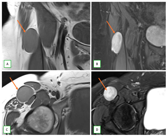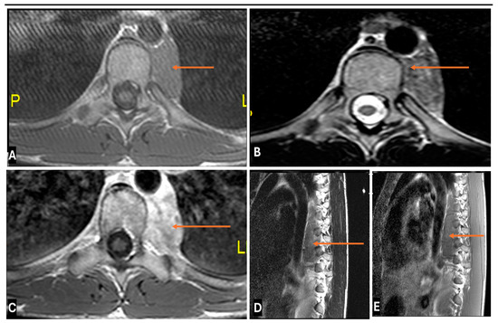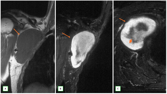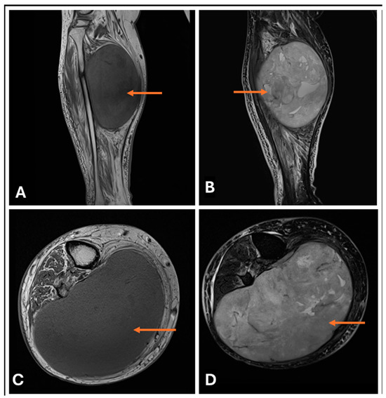 T2-weighted sequences highlight the internal signal intensity of PNSTs and assist in evaluating peritumoral edema [24], enhancing diagnostic confidence through identifiable patterns [24,28].