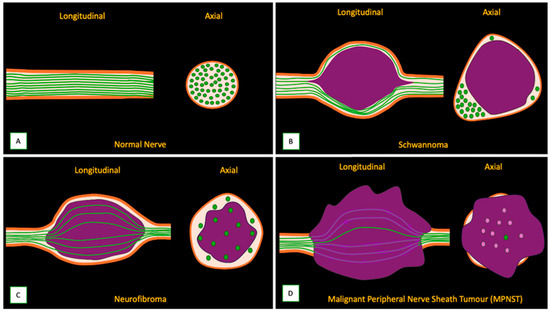 Illustrations showing a comparison of imaging features of normal and pathological nerves. (A) Longitudinal and axial images of the normal nerve, (B) eccentric growth pattern of schwannoma displacing the residual nerve fibers to the periphery, (C) neurofibroma showing a typical growth pattern splaying fascicles around the tumor, (D) illustration showing a malignant peripheral nerve sheath tumor (MPNST) with an infiltrative growth pattern disrupting the fascicular architecture and extra-neural extension.
