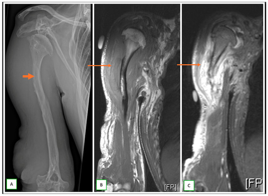 Plexiform neurofibroma in a 75-year-old man with a case of neurofibromatosis type 1 who presented with a right arm painful lump. The frontal radiograph of the right humerus (A) shows a congenital dysplasia/remodeling with a bowed gracile right humerus (Thick arrows). Coronal T1 (B) and coronal fat-saturated T2 (C) images show a plexiform neurofibroma (Thin arrows) which appears as a diffusely long segment enlargement of multiple arm nerves akin to a “bag of worms”.