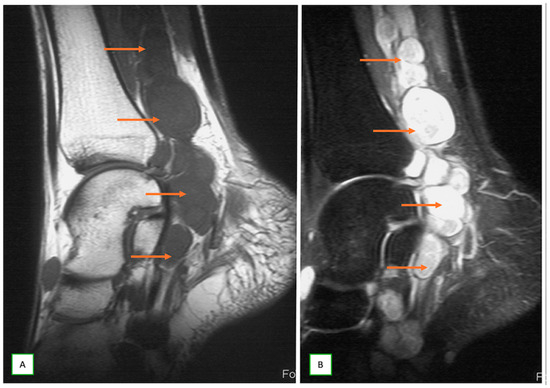 - Lipofibromatous hamartoma (lipomatosis) of the nerve is characterized by fibro-fatty tissue proliferation within the epineurium, displaying a coaxial cable-like morphology on axial MR images and a spaghetti-like configuration on longitudinal MR images [29] (Figure 15).
