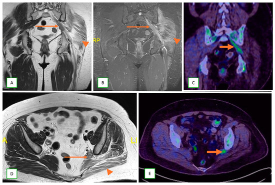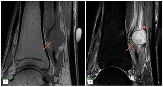 Compared with BPNSTs, MPNSTs are usually larger than 5 cm in diameter and have a rapid growth rate [52]. Unlike the well-circumscribed margins of BPNSTs, MPNSTs often present with poorly defined margins, as they infiltrate adjacent soft tissues [30]. MPNSTs generally show heterogeneous signal intensity on both T1- and T2-weighted images, with central necrosis or hemorrhagic areas, and often lack the characteristic T2-W “target signs” of BPNSTs [8]. MPNSTs typically show early heterogeneous arterial contrast enhancement with rapid washout on dynamic studies [33]. Peritumoral edema (PTE) is more common and extensive in MPNSTs than in BPNSTs, and is minimal and often absent [34] (Figure 13). MPNSTs tend to have lower apparent diffusion coefficient (ADC) values than benign PNSTs, with a suggested cut-off of 1.0–1.1 × 10−3 mm2/s [53]. Diffusion tensor imaging (DTI) may reveal more extensive disruption of nerve fibers in MPNSTs [25]. MPNSTs commonly show a high FDG uptake, often greater than 3.5 SUVmax, mainly in patients with type 1 neurofibromatosis [43].