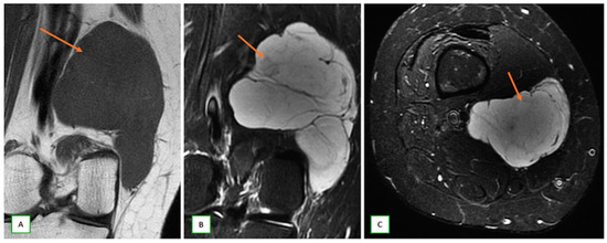 Figure 14. Myxoid nerve sheath tumor in a 59-year-old woman with a lump behind the knee. Coronal T1 (A), coronal (B), and axial (C) fat-saturated T2 images show a myxoid tumor (thin arrows) showing an extremely high signal on the T2-weighted images.