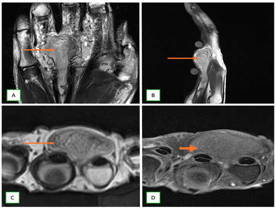 Figure 15. Lipofibromatous hamartoma of a digital nerve in a 53-year-old woman with a lump in their right hand. Coronal T1 (A), sagittal T2 (B), axial T1 (C), and axial fat-saturated T2 (D) fat-saturated T2 images showing the fatty components (thin arrows) appearing hyperintense on both T1 and T2-weighted images with suppression of signal on the fat-saturation images (thick arrows).