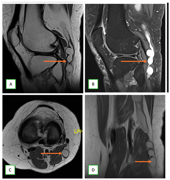 Figure 16. Intraneural ganglion cyst of the tibial nerve in a 39-year-old woman with a painful lump behind the left knee. Sagittal T1 (A), sagittal fat-saturated T2 (B), axial T1 (C), and coronal T1 (D) images show the cystic lesion within the nerve (thin arrow), which appears low on T1- and high on T2-weighted images.