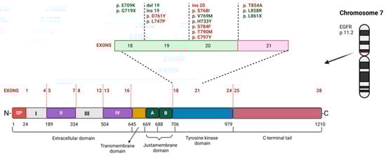 The organization of the EGFR gene, located in the p14–p12 region of human chromosome 7 [], is shown in Figure 2. Different parts of this gene are sites for mutations that can cause EGFR to switch from a proto-oncogene to an oncogene. Further mutations in this gene may occur as a result of intensive therapy. It is important to distinguish between genetic mutations (substitutions, insertions (ins), or deletions (del)) that exist prior to treatment and those that occur in response to treatment with tyrosine kinase inhibitors (TKIs) or humanized monoclonal antibodies against EGFR. While the former may not affect the sensitivity of cells to treatments targeting EGFR and its tyrosine kinase activity, the latter have the potential to reduce the efficacy of treatment with TKIs and, sometimes, with humanized monoclonal antibodies against EGFR [].