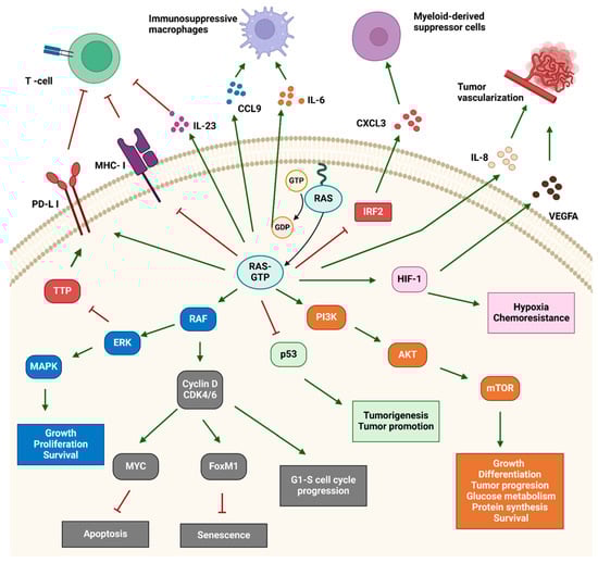 In order for cancer cells to survive and grow, they must evade the immune system. RAS reduces the expression of MHC-1 (major histocompatibility complex 1) on the cell surface, making the cells less vulnerable to death induced by cytotoxic T cells [,]. RAS also promotes the evasion of cancer cells from the immune system by stabilizing the mRNA of PD-L1(programmed cell death ligand 1) in a MEK (mitogen-activated protein kinase kinase)-dependent manner through downregulation of tristetraprolin (TTP/ZFP36), which binds and degrades mRNA [].