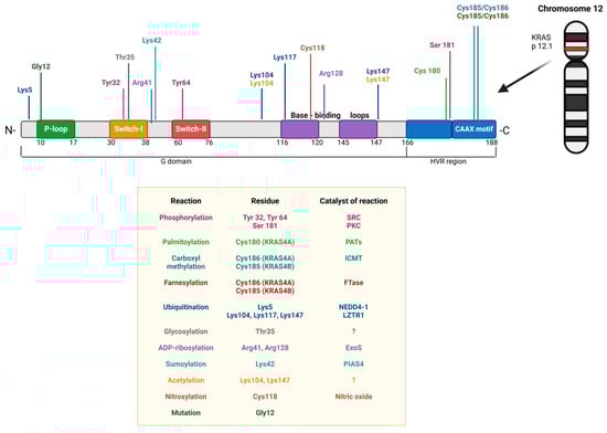 Schematic visualization of KRAS post-translational modification. Different modifications are distinguished by color in the yellow box (Phosphorylation—pink, Palmitoylation—green, Carboxylmetylation—dark green, Farnesylation—red, Ubiquitination—blue, Glycosylation—grey, ADP-ribosylation—purple, Sumolation—cyan, Acetylation—orange, Nitrosylation—brown). Switch 1 includes residues 25–40, and switch 2 includes residues 57–75, as well as the P-loop (phosphate-binding region) residues 10–17. The second lobe, comprised of residues 87–166, is a regulatory domain and contains allosteric regions such as helix 3 and loop. As found in all RAS GTPases, the HVR (hypervariable region) is located at the end of the second lobe, in K-Ras4B, comprising a 24-residue segment with the very C-terminal CAAX sequence (C, cysteine; A, aliphatic amino acid; X, any amino acid). ?—As yet unknown enzyme.