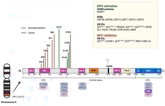 Ubiquitination, another type of PTM, also affects the lifespan of the MYC protein. In the normal non-tumor cell, excess MYC protein expression is removed by the ubiquitin–proteasome system, where MYC is rapidly degraded []. In tumor cells, the balance between MYC expression and degradation is skewed in favor of expression, leading to accumulation of MYC protein in the cell, its increased stability and hyperactivity. This leads to accelerated cell proliferation, inhibition of apoptosis and, ultimately, cancer initiation and progression []. Modified E3 ubiquitin ligases such as FBW7 (F-box and WD repeat domain-containing 7), SKP2 (S-phase kinase-associated protein 2) or TRIM32 (Tripartite motif-containing protein 32), which recognize specific MYC sequences and catalyze the transfer of ubiquitin to MYC, are responsible for the deregulation of these mechanisms []. Ubiquitination of MYC can be reversed by deubiquitinating enzymes (DUBs) such as USP7, USP13, USP22, USP28, and USP37 []. Recently, USP7 has been shown to stabilize MYC by antagonizing TRIM32-mediated polyubiquitination, and this process is required for neural stem cell maintenance []. The DUB enzymes USP22, USP28 and USP37 interact with MYC in the nucleoplasm and USP36 in the nucleolus and reverse Fbw7a-mediated MYC ubiquitination, which is essential for cancer cell proliferation [,,,]. Overexpression of USP22 leads to slowed growth, migration, and tumorigenesis of breast cancer cells in a MYC -dependent manner []. Overexpression of USP28 has been found in colon and breast cancer []. High levels of USP36 expression have been found in human breast and lung cancer, suggesting an oncogenic role []. USP37 is also upregulated in human lung cancer tissues, and positively correlates with MYC content []. FBXL14 ubiquitinates and destabilizes MYC, whereas USP13 is able to stabilize MYC by antagonizing the FBXL14-mediated ubiquitination process.